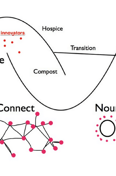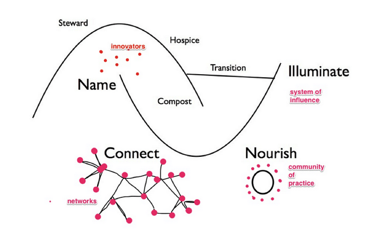 Mientras el viejo sistema dominante está vigente, el mismo es sostenido por los distintos actores del sistema, como son los defensores y estabilizadores -Stewards-. Luego, como en todo ciclo de vida y sistema vivo, llega un momento en que comienza a declinar, necesita ser asistido y hospitalizado -Hospice-, hasta que finalmente sucede su muerte y compostaje.