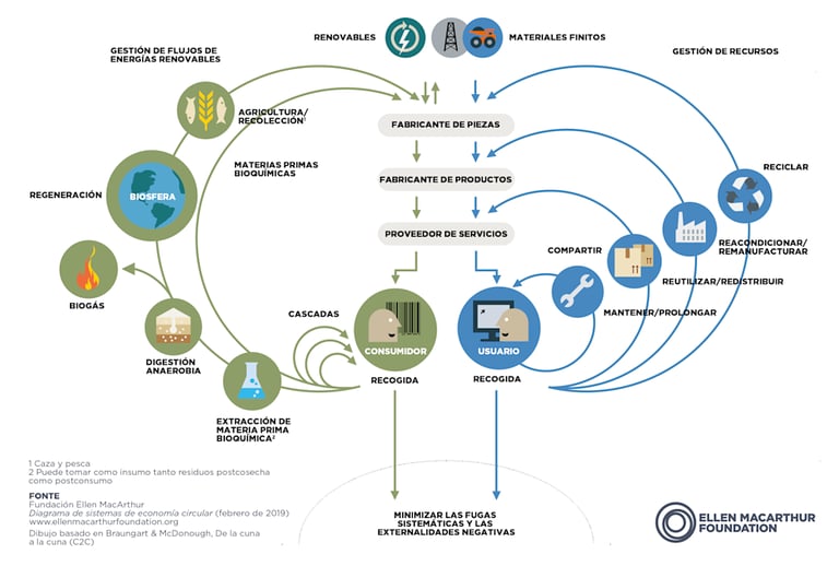 Estamos ante la impresecendible tarea de resideñar los modelos de negocio en idioma circular, con estrategias que permitan crear valor a partir de energías limpias, de mantener los stocks de materiales que ya están dentro de las cadenas de valor, diseñando productos que puedan perdurar y aprovechando los materiales de origen biológico para realimentar los flujos regenerativos de la naturaleza.